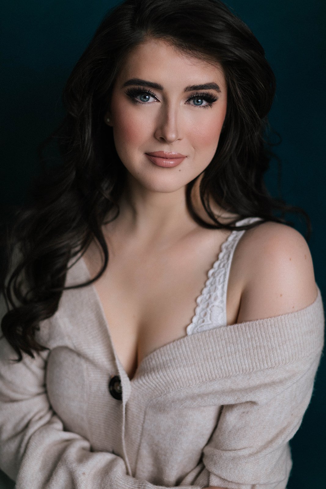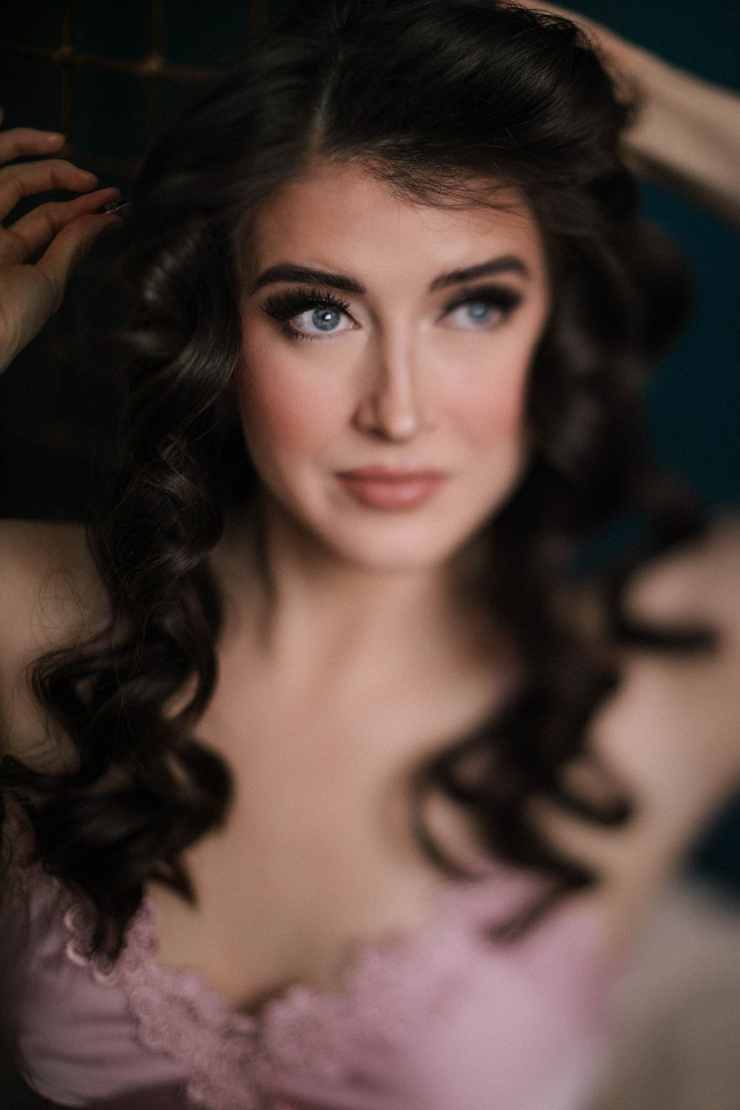 Soft glam makeup, focusing on accentuating her gorgeous blue eyes, luminous skin and a soft feminine pink for the cheeks and lips