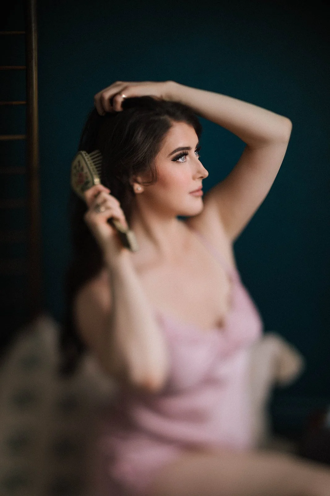 I adored the contrast between so many textures during this session. Structured pin curls to soft, bouncy waves. Buttery silk to soft wool. Metallic details of the vintage brushes to the fluttery lace of the fan.